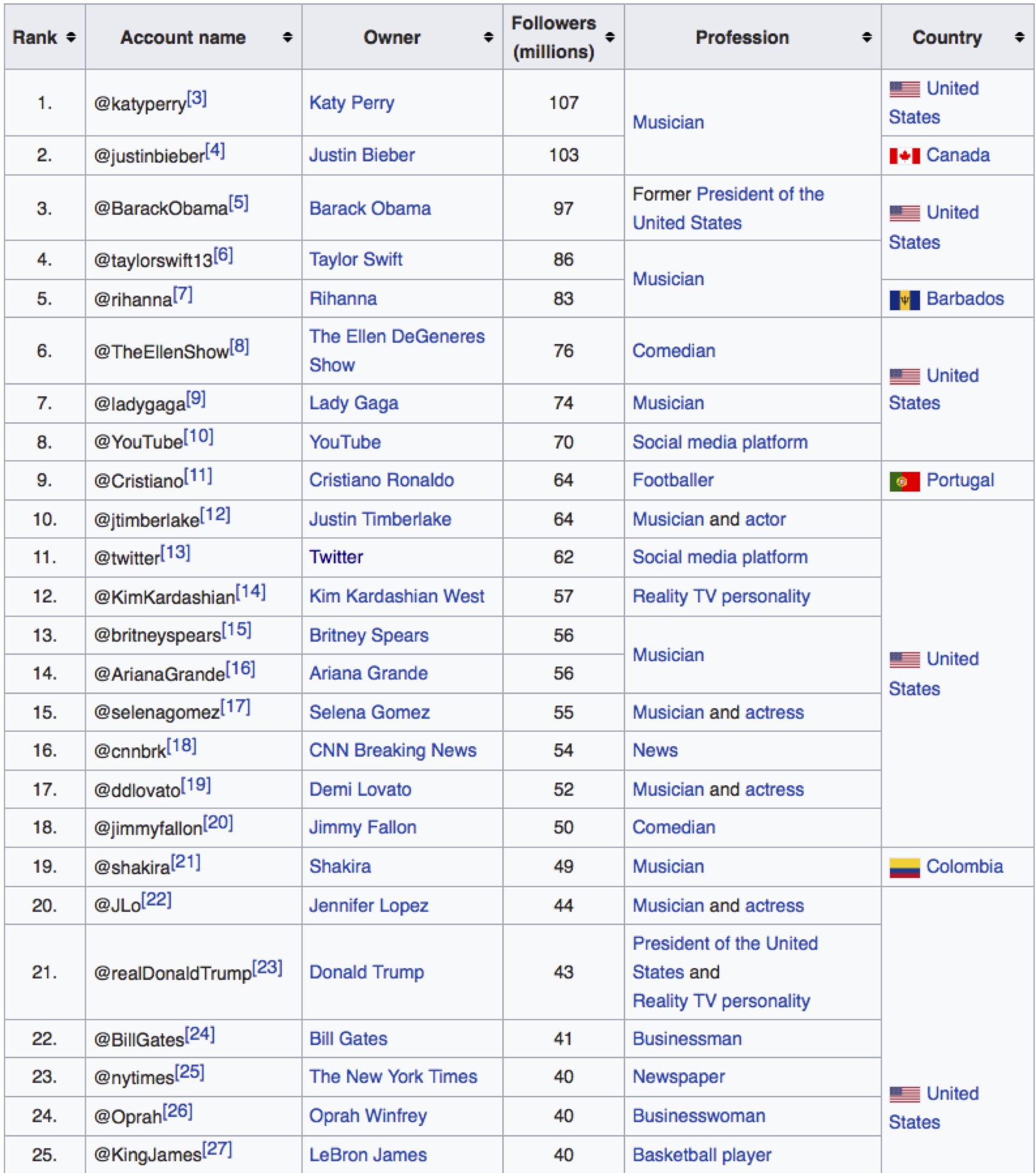 Worldwide Top 25 Twitter Account (by Followers) November 2017