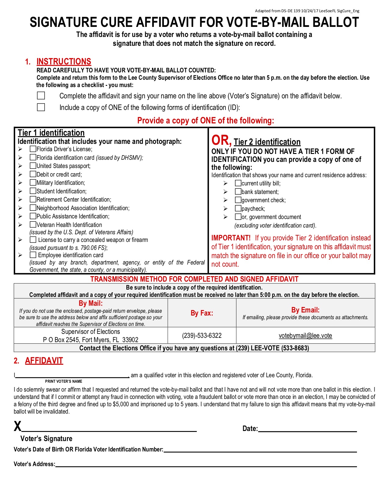 Lee County Florida Signature Cure Affidavit 2018