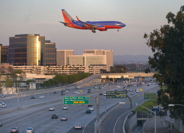 BETWEEN MILE 14 AND 15 - An airplane glides over the 405 freeway at John Wayne Airport in Costa Mesa as seen from the OC Marathon route on Red HIll Avenue.