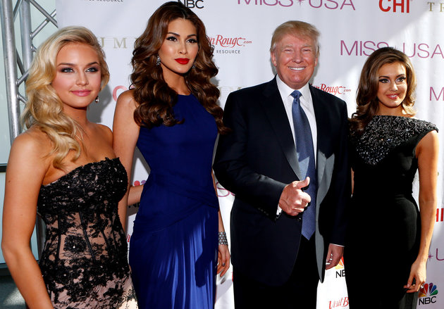 (left to right) Miss Teen USA 2013 Cassidy Wolf, Miss Universe 2013 Gabriela Isler, Donald Trump, and Miss USA 2013 Erin Brady pose during a red carpet event before the Miss USA 2014 pageant in Baton Rouge, La., Sunday, June 8, 2014. (AP Photo/Jonathan Bachman)